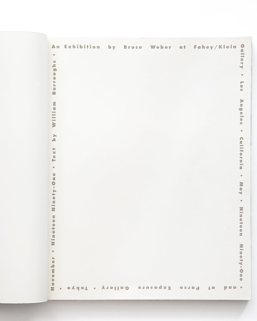 This beautiful catalogue was made for Bruce Weber’s 1991 exhibition, which started in LA at the Fahey/Klein Gallery and later traveled to Parco Exposure Gallery in Tokyo. It brings together a great selection of his work — fashion editorials, portraits of celebrities, personal photographs, and even photos of dogs and cats. Alongside the images are essays by Bruce Weber and writer William S. Burroughs.
